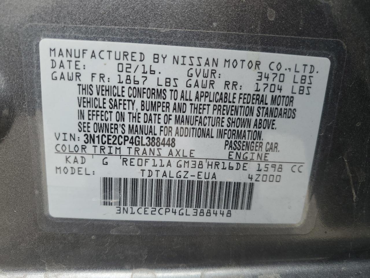 Машина оснащена 4 цилиндровым двигателем объемом 1.6 литров. Коробка передач - автомат. Тип топлива данной модели – бензин. Согласно фотоотчету с аукциона Copart пробег составляет 140 457 км. Номер кузова VIN - 3N1CE2CP4GL388448.