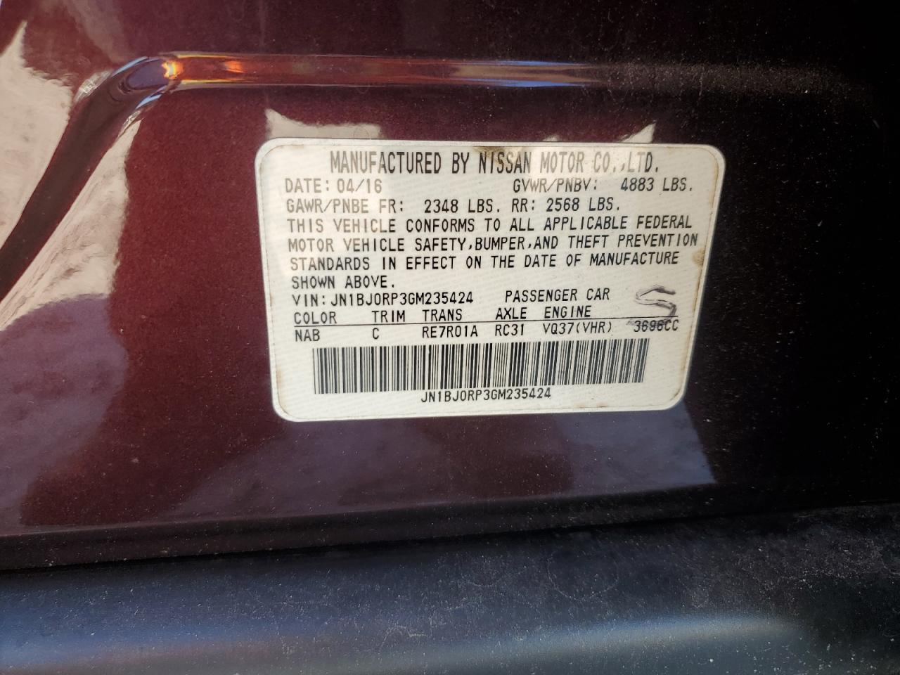 Машина оснащена 6 цилиндровым двигателем объемом 3.7 литров. Коробка передач - автомат. Тип топлива данной модели – бензин. Согласно фотоотчету с аукциона Copart пробег составляет 172 684 км. Номер кузова VIN - JN1BJ0RP3GM235424.