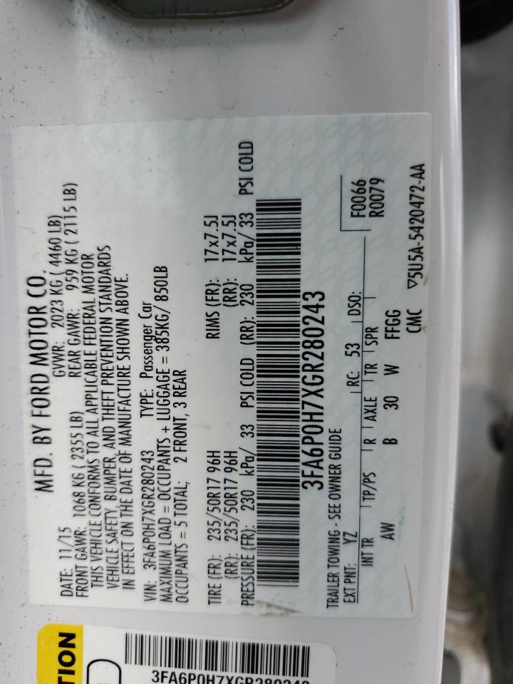 2016 FORD FUSION SE 3FA6P0H7XGR280243