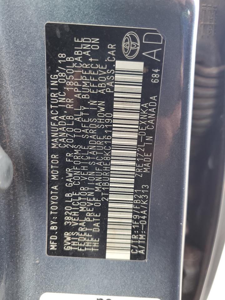 2019 TOYOTA COROLLA L 2T1BURHE8KC161190
