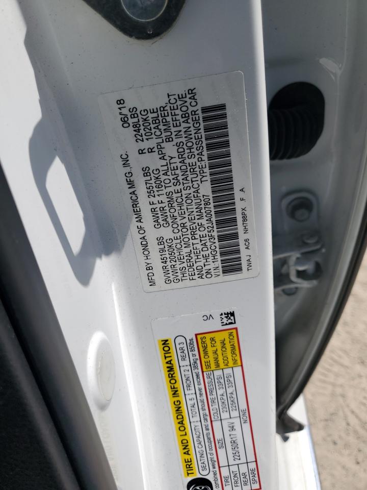 Машина оснащена 4 цилиндровым двигателем объемом 2.0 литров. Коробка передач - автомат. Тип топлива данной модели – гибрид. Согласно фотоотчету с аукциона Copart пробег составляет 125 004 км. Номер кузова VIN - 1HGCV3F52JA007807.