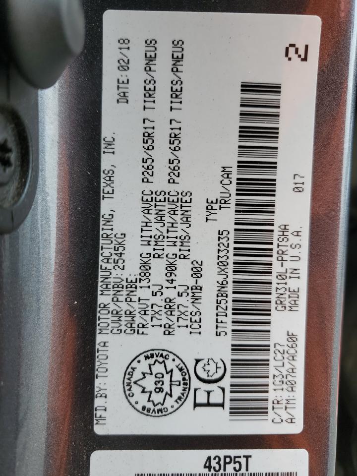 Машина оснащена 6 цилиндровым двигателем объемом 3.5 литров. Коробка передач - автомат. Тип топлива данной модели – бензин. Согласно фотоотчету с аукциона Copart пробег составляет 108 022 км. Номер кузова VIN - 5TFDZ5BN6JX033235.