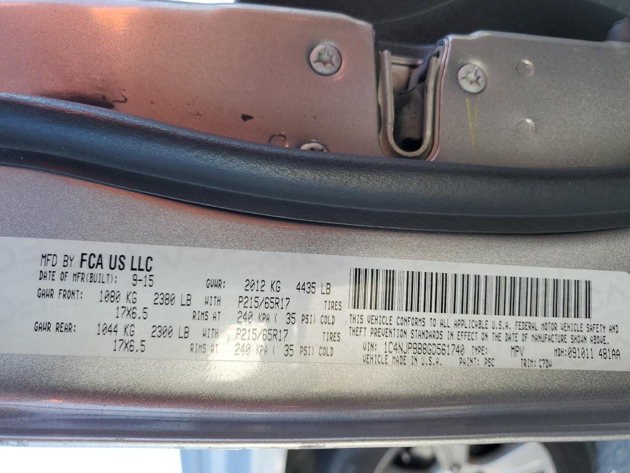 Машина оснащена 4 цилиндровым двигателем объемом 2.4 литров. Данный паркетник имеет передний привод. Коробка передач - автомат. Тип топлива данной модели – бензин. Согласно фотоотчету с аукциона Copart пробег составляет 256 277 км. Номер кузова VIN - 1C4NJPBB8GD561740.