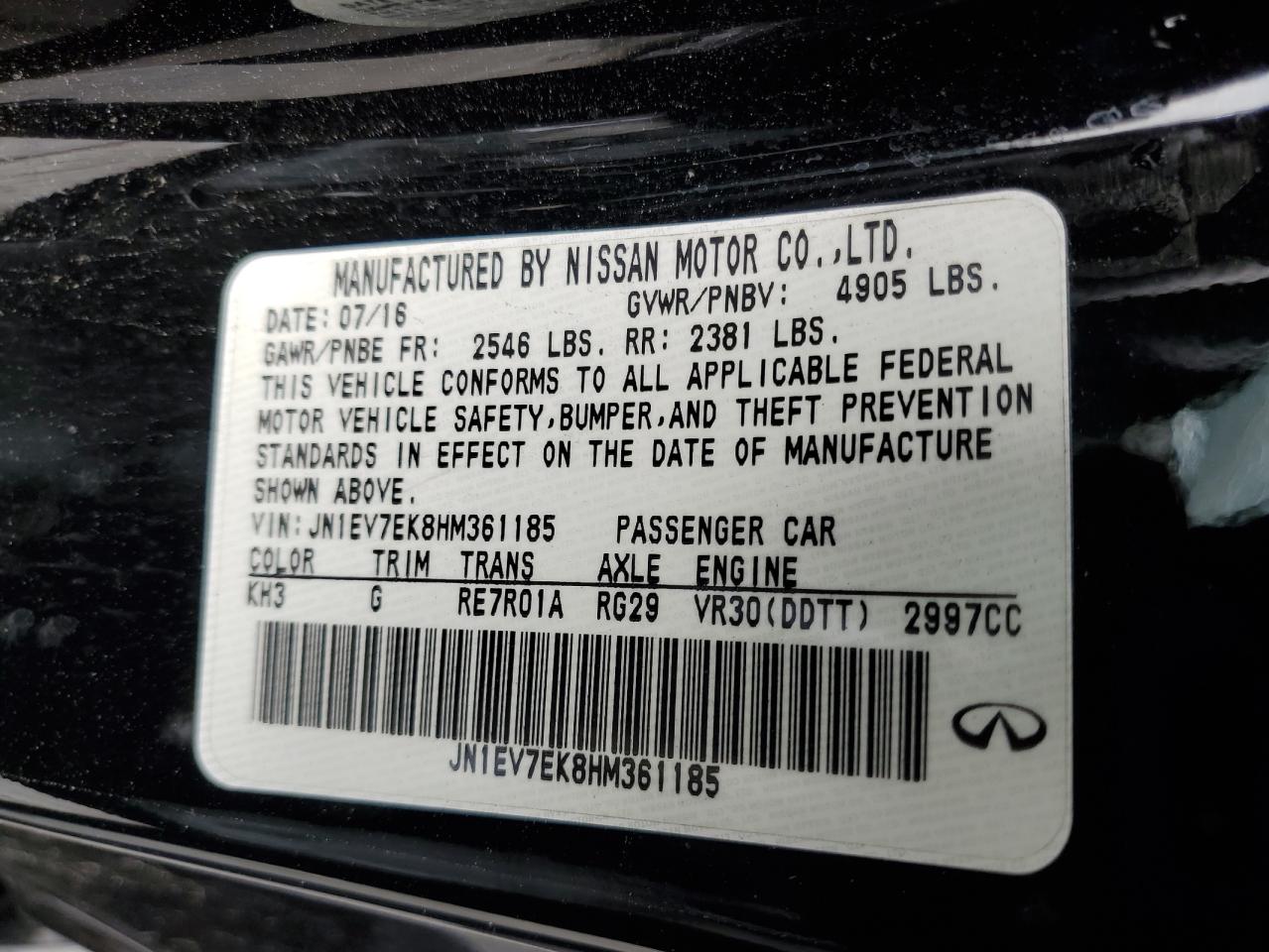 Машина оснащена 6 цилиндровым двигателем объемом 3.0 литров. Коробка передач - автомат. Тип топлива данной модели – бензин. Согласно фотоотчету с аукциона Copart пробег составляет 131 517 км. Номер кузова VIN - JN1EV7EK8HM361185.