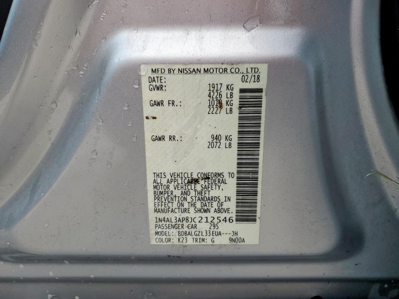 Машина оснащена 4 цилиндровым двигателем объемом 2.5 литров. Коробка передач - автомат. Тип топлива данной модели – бензин. Согласно фотоотчету с аукциона Copart пробег составляет 127 072 км. Номер кузова VIN - 1N4AL3AP8JC212546.